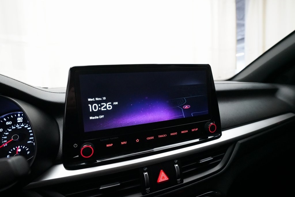 Kia Certified Pre-Owned Certified, 10-Way Power Driver's Seat, 18" x 7.5J Alloy Wheels, 4-Wheel Disc Brakes, 6 Speakers, ABS Brakes, Air Conditioning, Alloy wheels, AM/FM Radio, Available Sirius XM Radio, Apple CarPlay & Android Auto, Auto High-beam Headlights, Automatic temperature control, Brake Assist, Bumpers: body-color, Cloth & SynTex Seat Trim, Delay-off headlights, Driver door bin, Driver vanity mirror, Dual front impact airbags, Dual front side impact airbags, Dual-Climate Control, Electronic Stability Control, Emergency Communication System, Four wheel independent suspension, Front anti-roll bar, Front Bucket Seats, Front Center Armrest, Front Fog Lights, Front reading lights, Fully Automatic Headlights, GT2 Package, Heated & Ventilated Front Seats, Heated Sideview Mirrors, Illuminated Entry, Leather Shift Knob, Leather steering wheel, LED Interior Lighting, Low Tire Pressure Warning, Navigation System, Occupant sensing airbag, Outside Temperature Display, Overhead airbag, Overhead console, Panic Alarm, Parking Distance Warning-Reverse, Passenger door bin, Passenger vanity mirror, Power door mirrors, Power steering, Power Sunroof, Power Windows, Radio data system, Radio: 10.25" Display Audio, Radio: harman kardon Premium Audio, Rear anti-roll bar, Rear seat center armrest, Rear Spoiler, Rear-View Camera, Rear/Front Window Defroster, Remote Keyless Entry, Security System, Speed control, Split Folding Rear Seat, Sport steering wheel, Steering Wheel Mounted Controls, SynTex Seat Trim, Tachometer, Telescoping steering wheel, Tilt steering wheel, Traction Control, Trip computer, Turn Signal Indicator Mirrors, Variably intermittent wipers.